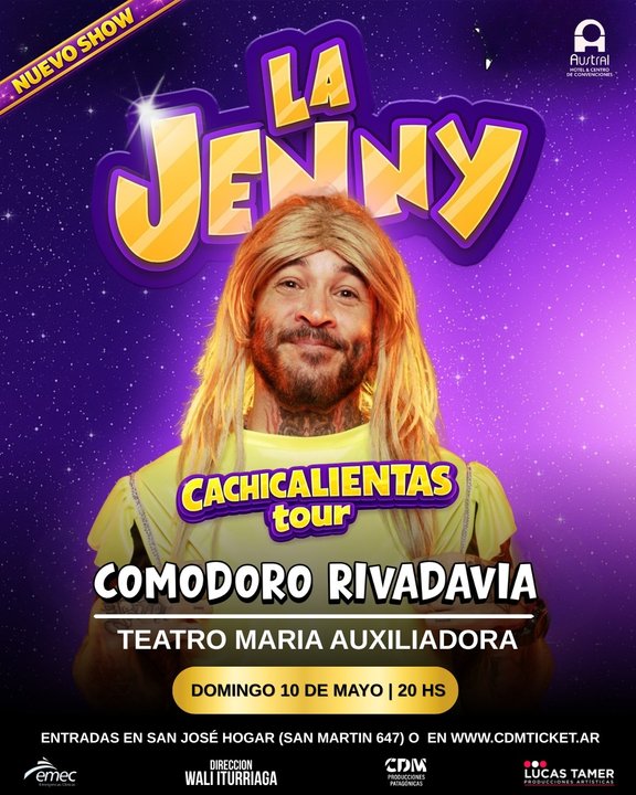 La Jenny, el fenómeno creado por Wali Iturriaga, regresa a los escenarios con su «Cachicalientas Tour». El espectáculo tendrá su gran estreno en Comodoro Rivadavia el próximo 10 de mayo, a las 20 horas, en el Teatro María Auxiliadora.